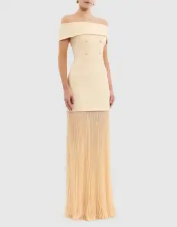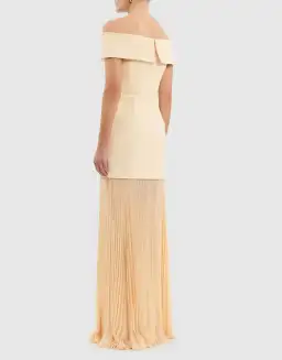 - Structured fabric with lace skirt; lined- Bardot gown- Fitted bodice with boning- Front button detailing- Fitted waist- Sheer pleated skirt- Zip at back