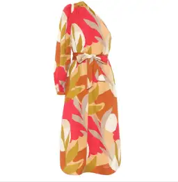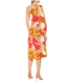A bold red botanical print, inspired by hot nights in Havana, animates this one-shoulder design, while a self-tie sash belt creates a feminine silhouette.