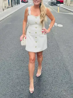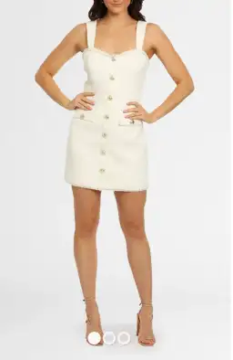 Look feminine, elegant and chic in this effortlessly sophisticated dress from Rebecca Vallance. The Sigourney Mini features a sweetheart neckline, gold hardware, and a thick tweed fabrication.