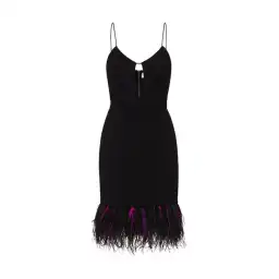 Influenced by post pandemic opulence, the Bronx Keyhole Mini Dress is one of our favourite silhouettes, combining flirty and fun. Designed in a medium-weight fabric with a fitted bodice complemented with a centre front keyhole opening, slender rouleau straps and a fitted mini skirt. Finalise your look with a metallic strappy heels to complement the multicoloured ostrich feathers dangling along the hemline.