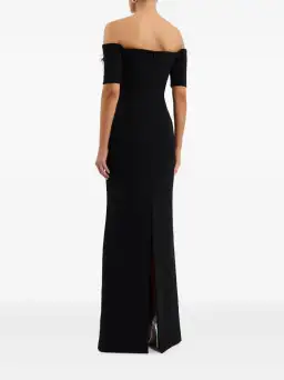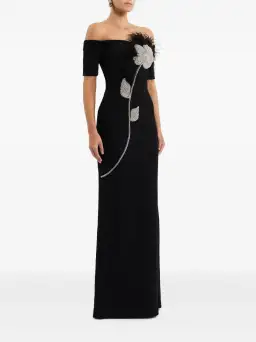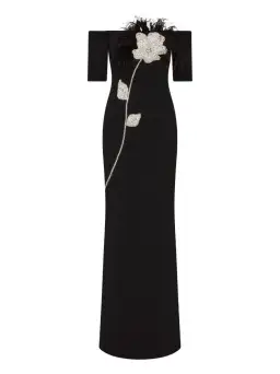 The Starlight Gown in black epitomises timeless glamour, featuring intricate hand-beaded floral embroidery and feather detailing for a touch of opulence. The off the shoulder neckline seamlessly harmonises with the fitted bodice to shape a feminine silhouette, accentuated by princess seams and a cinched waist. The column maxi skirt exudes sophistication, detailed with a back split for added allure. Lined and secured with a zip fastening at the back, this gown is designed to make a statement.
