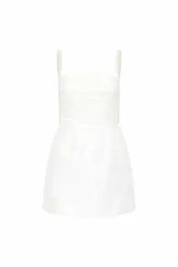 The Esther Strap Mini Dress in ivory radiates glamour and charm. It features embellished pearl straps and a square neckline, with a fitted bodice and cinched waist that shape a feminine figure. The A-line mini skirt and crinoline hem enhances the silhouette, while side seam pockets add a functional element to the design. Fully lined with a zip fastening at the back, this dress seamlessly blends comfort and style. Only worn once at a lunch for a few hours. RRP $929.00