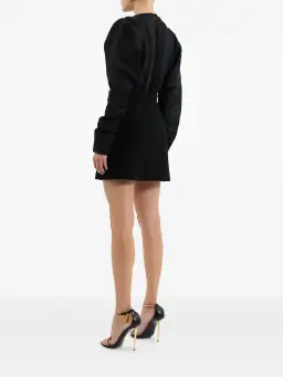 The Ursula Mini Dress in black redefines contemporary elegance. Its sheer, pleated bodice flows effortlessly, with a relaxed fit and cocoon long sleeves that shapes a timeless silhouette. Wide cuffs add a refined edge, while an extended keyhole slit at the back adds a touch of allure to the design. The A-line mini skirt, lined for comfort, is secured with an invisible zip fastening and cinched at the waist by a self-belt.