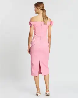 A form fitting off the shoulder silhoeutte uses it's clean lines to emphasise the feminine shape, and the bow details on the arms add a fun and flirty edge to the dress.