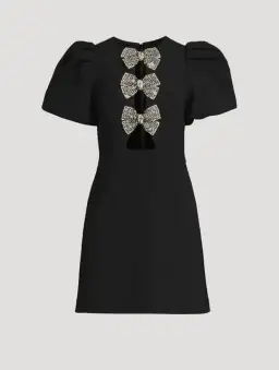 The Juliana Puff Sleeve Mini Dress is made of Bonded Crepe Fabric. This Dress features rounded neckline, voluminous puff sleeves, fitted bodice with front cut ours and diamante bows, cinched waits, A-line mini skirt, zip fastening at back and is lined.