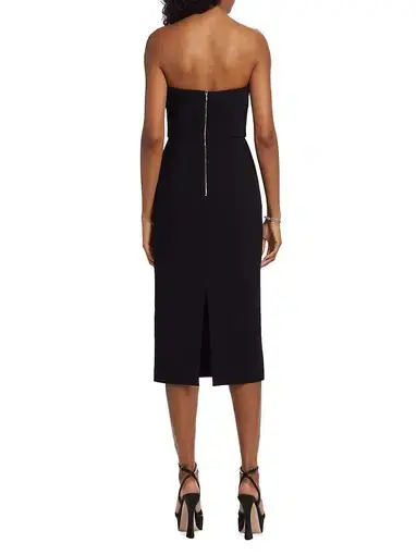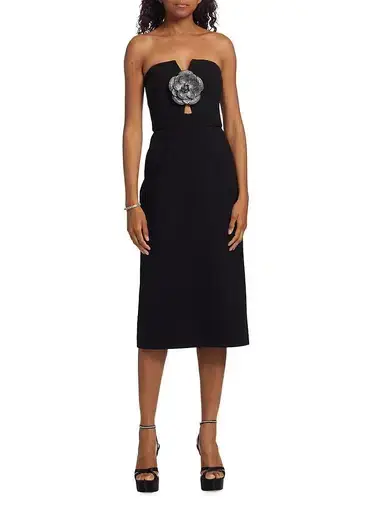 Rebecca Vallance's Yvonne midi-dress features a fitted silhouette crafted of crepe. A cut-out strapless bodice embellished with a sparkling rhinestone flower defines the look. Strapless Boning Cut-out bodice Back slit Exposed back-zip closure 98% polyester/2% elastane Lined Dry clean Imported