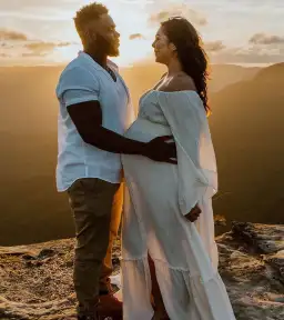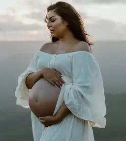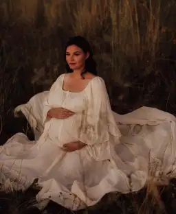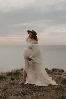 The Reclamation 'Ruffle Me Open' Gown in Buttercream is made of linen gauze, featuring an elasticated waistline and elasticated shoulder. As the name suggests, this gown has buttons all the way from top to bottom at the front, so it can be opened up to show off your bump.