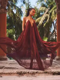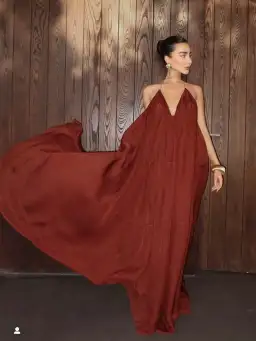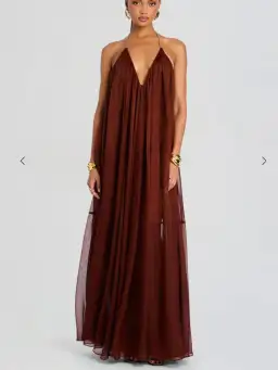 The Arlet Chiffon Dress features a plunging neckline with a unique chain halter neck detail and an open back design for a modern, elegant look. Made from lightweight chiffon, this dress flows beautifully, offering a comfortable fit paired with refined style. Shown here in Chestnut.