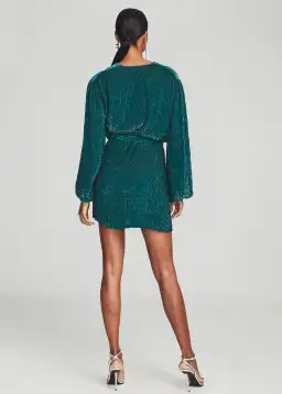 Introducing the ultimate party frock: The Gabrielle Robe. Enveloped in hand-stitched sequin embellishments, this timeless silhouette features a wrap bodice, which is complemented by voluminous blouson sleeves and a velvet tie belt to cinch the waist. For a micro mini moment, we recommend sizing down.