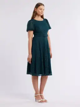 With a round neckline, short puff sleeves, and a knee length flippy skirt, the Avette Lace Dress is cinched in the waist with a matching lace belt.