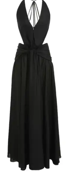 The Rhiannon Plunge Halter Maxi in Black from our Summer Swim 2025 Collection. A silk habutae halter neck maxi dress featuring a dramatic plunging V-neckline, fitted at the waist with exposed sides, an open back with self tie beaded drawstrings, finished with flared skirt detailing.