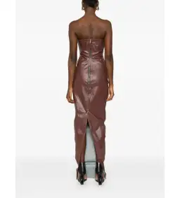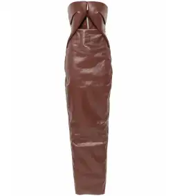 Rick Owens Prong Gown in brown is crafted from rubber, elastomultiester, and cotton for women. It is a stunning waxed denim gown that emulates faux leather and is very flattering to wear. As worn by Kim Kardashian.