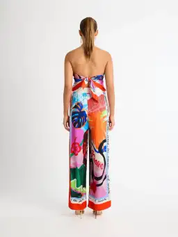 Features printed satin fabrication, relaxed styling, side seam pockets, elasticated waist with draw strings and side seam splits.