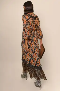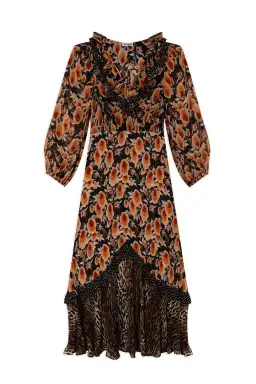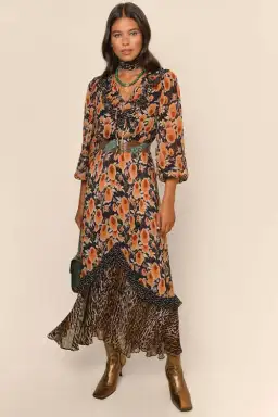Stuning Rixo Jaida Silk Dress with unique fabric design, warm colours, ruffle v neck, fitted at waist, tiered flowing hem.