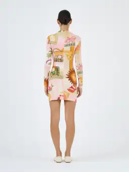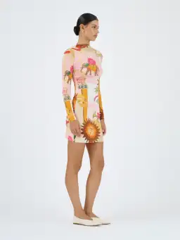 The Goldie Mini Dress in Pink City features a high neckline detail and long sleeves. This true mini dress is crafted from our ultra soft ecovero jersey fabrication to hug and flatter the body.
