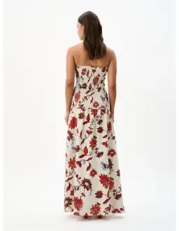 Fits true to size.- Strapless neckline- Ruched bust and bodice shape- Relaxed A-line skirt- Maxi length- Print exclusive to ROAME.