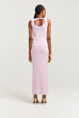 Best-selling Romee Knit Skirt, crafted in a Musk hue. Constructed in a delicate, variegated-rib fabrication, this maxi skirt silhouette features minor cut-out detailing on the hip. Designed to pair back with the Romee Knit Top for a fashion-forward take on set dressing.