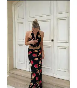 The Romy top and Evvy skirt in the Camellia fabric is an absolutely beautiful set that is perfect for a summer vacation, dinner and party. Seen on Sopha Dopha. No longer sold a VDM