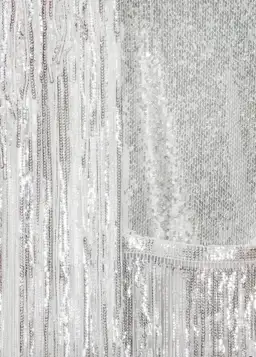 INTRODUCING OUR SEQUINS MINI FRINGE DRESS IN SILVER, CRAFTED FROM A BLEND OF 92% POLYESTER AND 8% ELASTANE. THIS MINI DRESS FEATURES A WRAPPED FRONT NECK WITH A KEYHOLE OPENING ON THE FRONT, AS WELL AS A HALTERNECK DRAWSTRING CLOSURE WITH OUR LOGO. IT INCLUDES AN OPEN BACK AND A SIDE SEAM ZIPPER WITH LOGO DETAILING. THE DRESS HAS DELICATE FRINGE DETAILS, MAKING IT A PERFECT CHOICE FOR A STYLISH AND EYE-CATCHING LOOK.