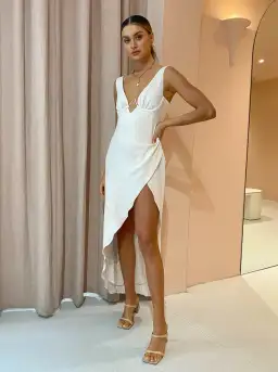 Plunge front maxi dress with an ultra fine covered underwire, tucks at front hip and cut away hem. Bodice is lined.