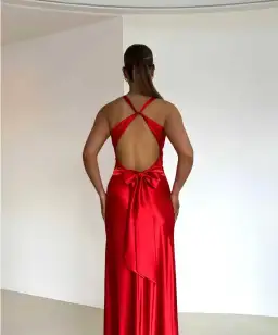 Vintage Ruth Tarvydas Midi Dress in a gorgeous rich red colour perfect for a formal! Satin material, unable to purchase anymore. Perfect for shorter girls looking for a longer style. I am 5'7 and it comes to mid shin. Beautiful tie cross back perfect to adjust sizing.