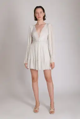 The Mars Dress in White by SABINA MUSAYEV is all clean lines, soft shimmer and considered drama—perfect for rehearsal dinners, modern brides, summer celebrations or long lunches under the sun. With its pleated metallic finish, long sleeves and sculpted waist, it offers structure without stiffness and movement without fuss. Available new with tags and exclusively for purchase, this is a piece made for statement occasions with lasting impact.