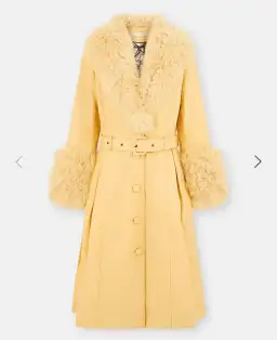 Saks Potts signature foxy shearling coat returns in a sweet shortbread hue detailed with a plush shearling trim. The essence of elegance, this modern coat has been detailed with two side slip pockets, a classic button placket and a belted waist.