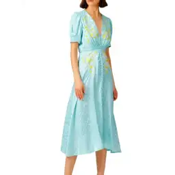 Blue and yellow silk (100% Silk). Hourglass. Short sleeves. V-neckline. Invisible back zipper with hook and eye closure. Partially lined. 48" from shoulder to hemline.