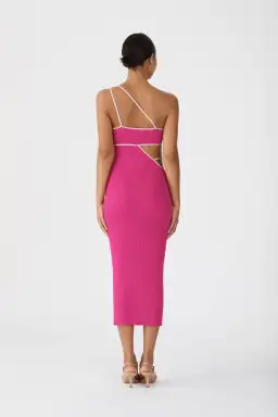 - Fitted style with one shoulder strap detail. Midi length. Contrast colour binding detail. Dry rib knit