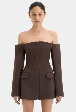 The Sandrine Tailored Mini Dress is a modern dress, crafted from a premium Italian suiting fabric. Inspired by the shape of a blazer, this style offers an off-shoulder fit with a single breasted design, punctuated waist, and front welt pockets. Featuring an internal corset to provide a structured look, pair yours with heels for your next occasion.