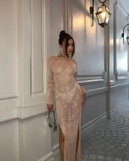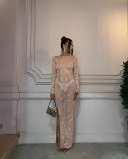 Maxi dress with slits on the sides and a hidden zipper on the back made of open knit fabric with rhinestone embellishments throughout.