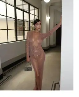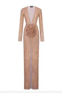 Maxi dress with slits and made of open knit fabric with rhinestone embellishments throughout. Undergarments not included