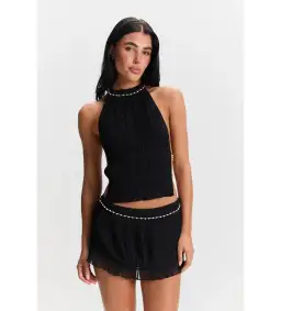 Introducing our Perla Top, a delightful creation crafted from intricately pleated sheer woven fabric. This apron-style top exudes elegance with its open back design, adorned by two under-bust panels gracefully linked by pearl chains. These exquisite pearls cascade across the back and drape around the neck, lending a charming necklace-like appearance. Whether you choose to combine it with our Perla mini skirt for a complete ensemble or dress it down for a chic daytime look with our Aria jeans, the Perla Top is your ticket to effortless style. Garment is double lined.