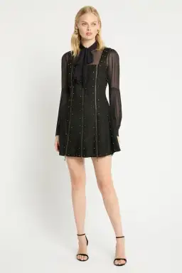 Delivering statement detailing, this little black dress uses clever panelling to flatter as it creates a neat fit to the waist, before kicking out in an exaggerated A-line shape at the skirt. Featuring wide straps at the shoulder, the dress fastens at the back with an exposed metal zip, with further zip detailing found through the front of the dress, bordered by brass stud embellishment.