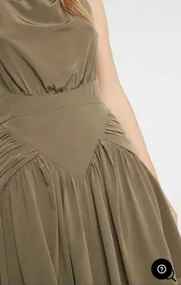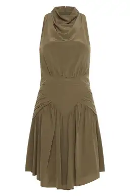 Revealing a gorgeously rich olive colouring, the dress exposes the shoulders with a high cowl neckline through to dropped armhole shaping.