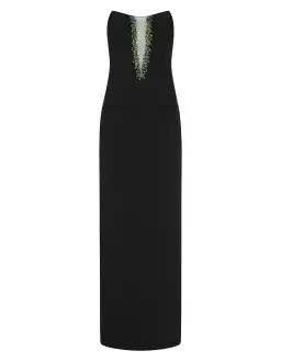 Skimming over the skin to reveal a flattering slim fit, this strapless maxi dress elevates its sleek black silhouette with a statement mesh cutout, framed by delicate tonal green beading. Flowing through mid-weight tailored fabric to full length, the fully lined dress continues its appeal with sharp shaping through the neckline, and a deep split at centre-back, below an invisible zip.