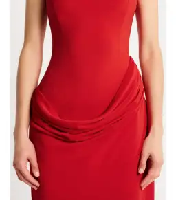Absolutely stunning, this scarlet gown flaunts fabulous colouring and a spectacular silhouette, which it accentuates with a structured hourglass corset and draped layering through the hips. Featuring a stylised strapless neckline with detachable straps, the dress reveals a gorgeous drape to maxi length within stretch jersey fabric, where a deep side seam split further enhances its look.