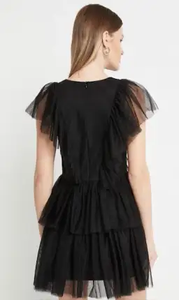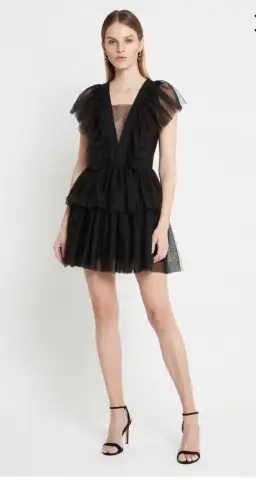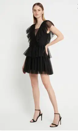 Lightweight and frothy, this little mini dress flaunts lush layers of tulle with full, gathered tiers through the skirt, accentuated by frill detailing that curves over the shoulder front to back. With its distinct V- neckline, the dress flatters further with its slim fit bodice. Full lining for comfort and invisible zip closure at the back