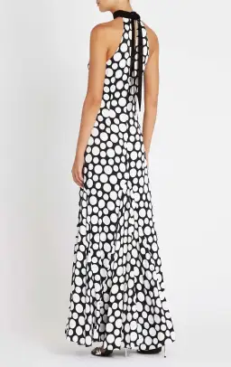 Following the curve of the body, this dazzling maxi dress kicks out to a flared fishtail hem created using godet inserts. Showing off a striking spotted print, the dress fastens at the back of the neck with a contrast black draped neck tie and an invisible zip closure, with keyhole openings both front and back.