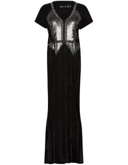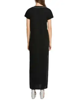 Descending through easy, slim shaping to a flattering ankle length, this tee dress pairs rich, deep black with dazzling sequin and beaded embellishment in shimmering metallic silver. Feeling soft against the skin as it flows through pure cotton, the dress is further complemented by an open V-neckline, short angled sleeves, and a deep side seam split to the thigh.