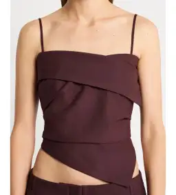 Using structured shaping to flatter within a dramatic asymmetric design, this corset top skims over the skin in a virgin wool stretch blend, flaunting a decidedly rich shade of merlot. Fastening discreetly at the side, the top uses folded detailing, gathers, and an angled asymmetric hemline to further enhance its look, while up top, it can either be worn strapless or with narrow straps.