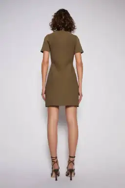 Khaki mini dress with gold detailing, bottom closure along the front, above the knee length, crepe stretch fabric, elegant style.