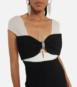 Self Portrait’s two-tone midi dress is punctuated by an oversized bow at the chest and flattering cut-out detail.