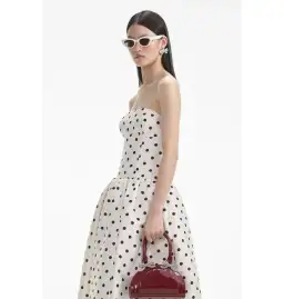 For partygoers after a hearty dose of vintage chic, this polka dot taffeta dress falls from a timeless bandeau neckline to a flattering dropped waist and full photo-ready midi skirt.