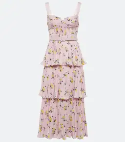 Self portrait floral satin tiered midi dress. Made from pleated satin, this tiered design features a charming floral print, a structured bodice, and a belt to highlight the waist.