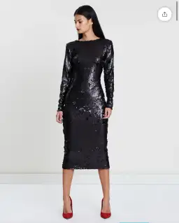 Fully lined constructed from a stretch black matte metallic sequin fabrication featuring a boat neckline, long sleeves, low drop back, and a pencil shape silhouette which tapers in at the hem.