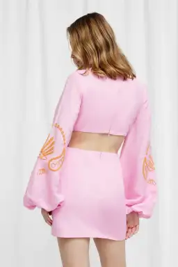 Pink mini dress with intricate orange embroidery, open back with zip closure.