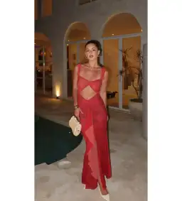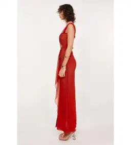 Imogen in Cherry Red features a mesmerizing mesh fabric that delicately drapes over your silhouette, creating a stunning and flattering fit. The long flare silhouette adds a touch of drama, allowing you to make a grand entrance wherever you go. The flowing lines of the dress create a sense of movement, making it ideal for twirling on the dance floor or capturing attention at social events.