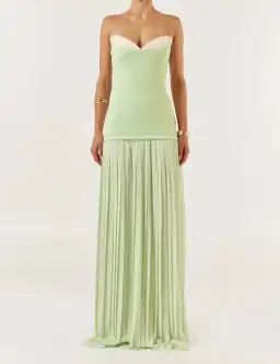 A flowy sophisticated and unabashedly feminine ideology, Nicolette gown undulates beautifully from a fitted strapless bodice into a tightly pleated floor-sweeping skirt. Ground the look with an occasion-ready pump that'll peep as the pleats dance.