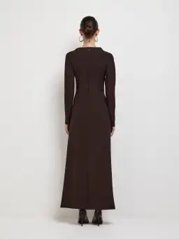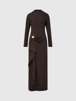 Alluring, structured silhouette. Introducing the Alicia Maxi Dress - showcasing a mocha bonded fabrication, a slim fit cut, draped neckline with shoulder tucks, long sleeves, hip ruffle and maxi length skirt.